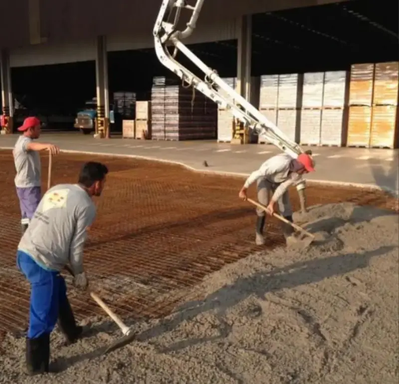 A empresa inicia o trabalho com o preparo da base, seguido pela aplicação do concreto com controle de espessura e acabamento superficial adequado às necessidades do cliente.